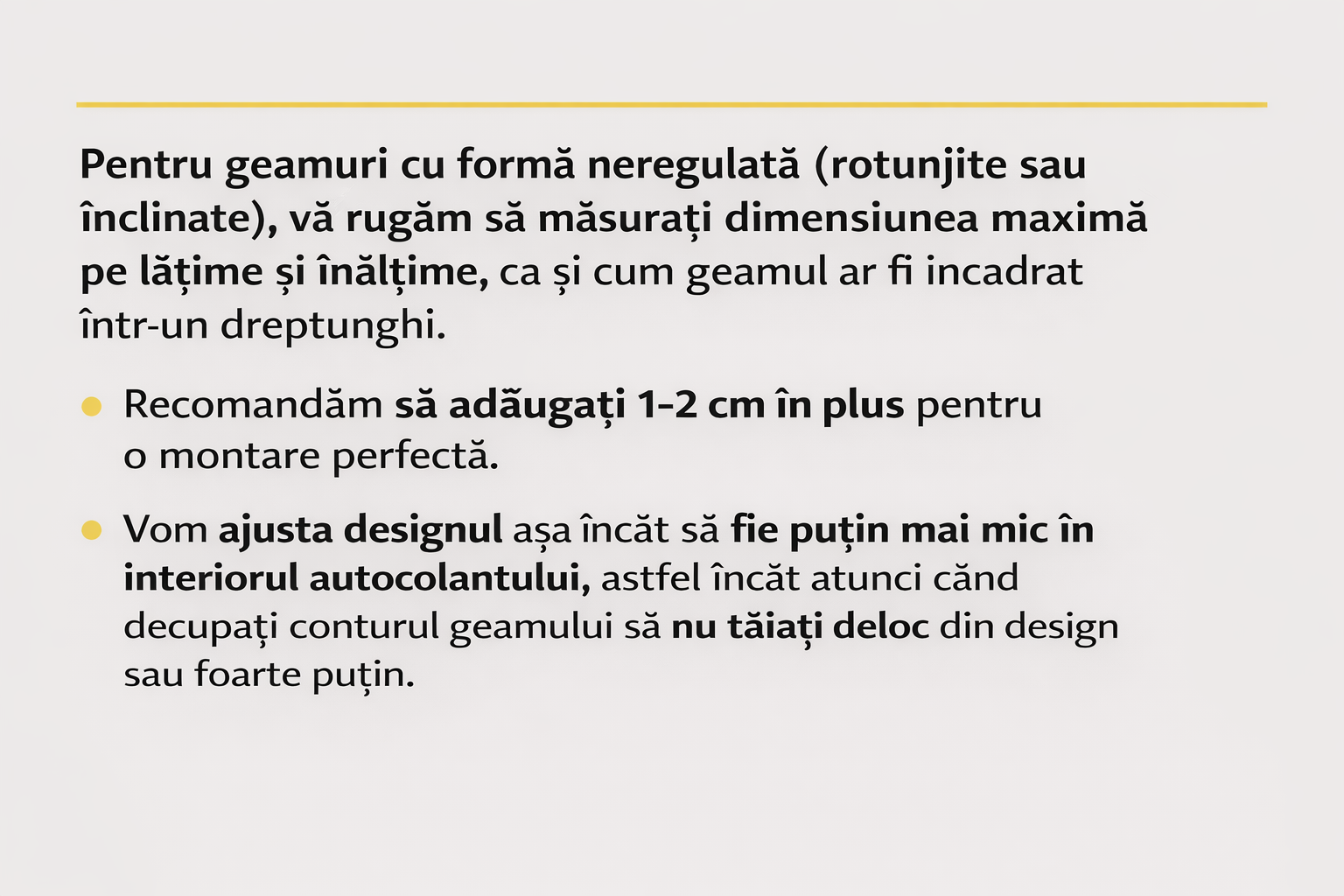 Pentru geamuri cu formă neregulată (rotunjite sau înclinate), vă rugăm să măsurați dimensiunea maximă pe lățime și înălțime, ca și cum geamul ar fi încadrat într-un dreptunghi.